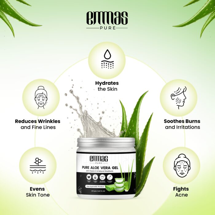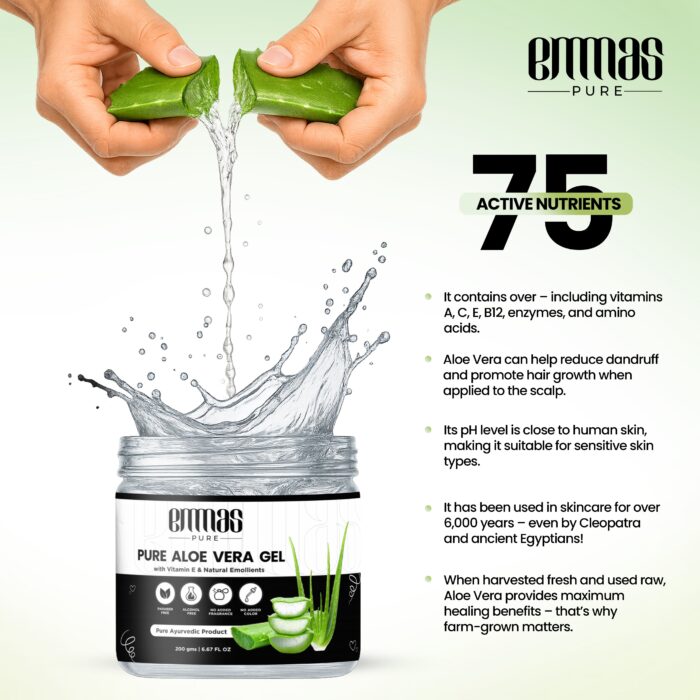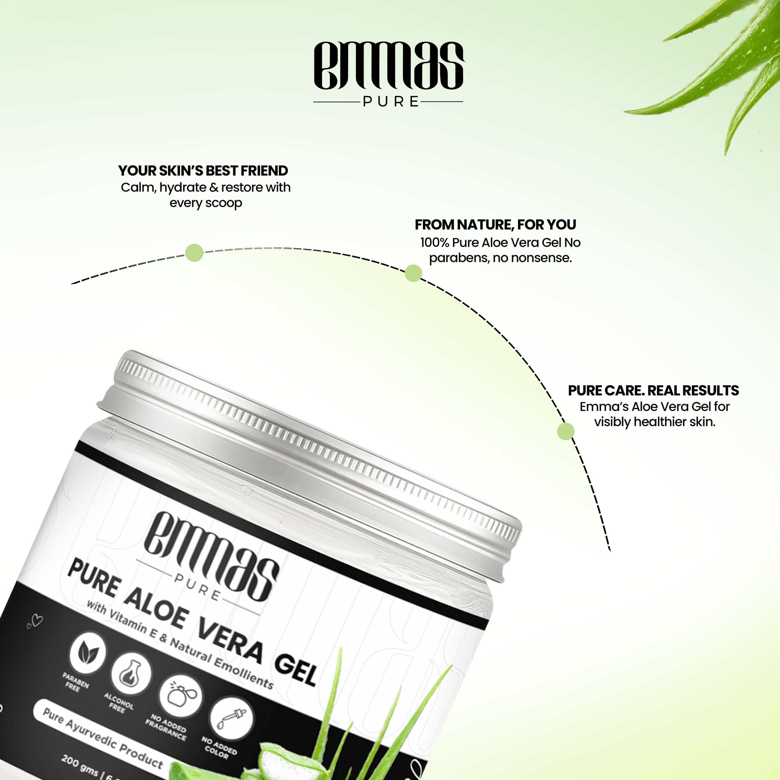 Experience the pure, soothing power of nature with Emmas Pure Aloe Vera Gel. This 100% natural, multipurpose gel is your all-in-one solution for face, hair, and skin care. Free from harmful parabens and sulphates, it provides gentle yet effective hydration. Use it to soothe sunburnt skin, calm acne-prone areas, moisturize dry hair, or as a daily skin hydrator. Its lightweight, non-greasy formula absorbs quickly, leaving your skin feeling cool, refreshed, and deeply nourished. Perfect for all skin types and suitable for everyone, it’s the natural choice for a healthy, radiant glow.