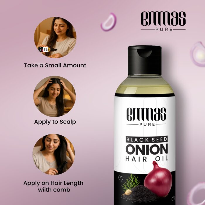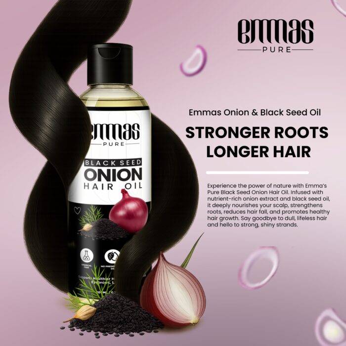 Revitalize your hair with the powerful combination of Emmas Pure Onion Oil. This unique formula blends the hair-strengthening properties of Red Onion extract with the nourishing benefits of Black Seed oil to create a potent solution for hair fall. This oil penetrates deep into the scalp to stimulate follicles, boost growth, and reduce thinning. It also helps to combat dandruff and repair damage caused by heat and pollution. Made in India and free from parabens and fragrances, it’s a natural and effective way to restore your hair’s strength, vitality, and shine.