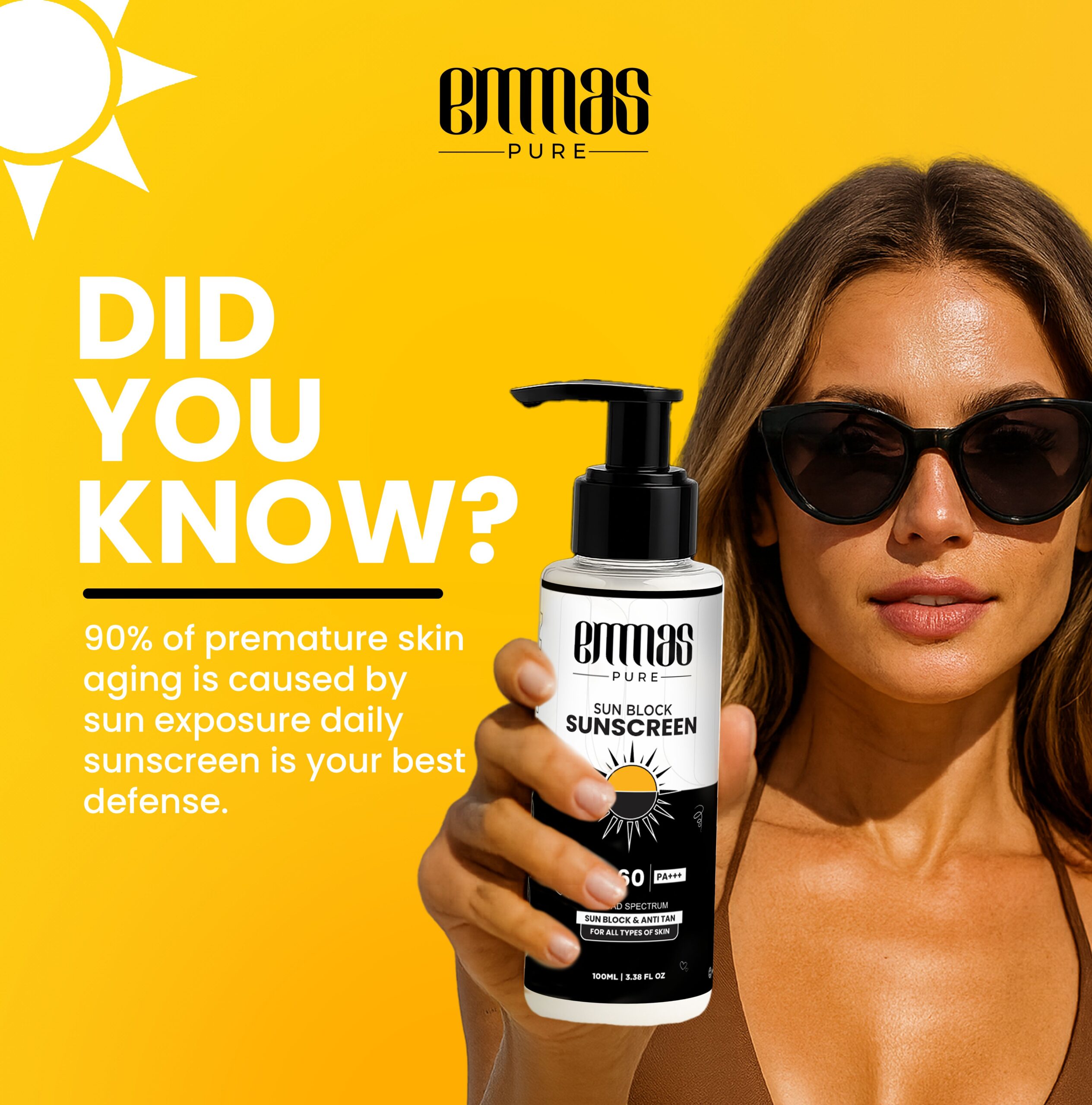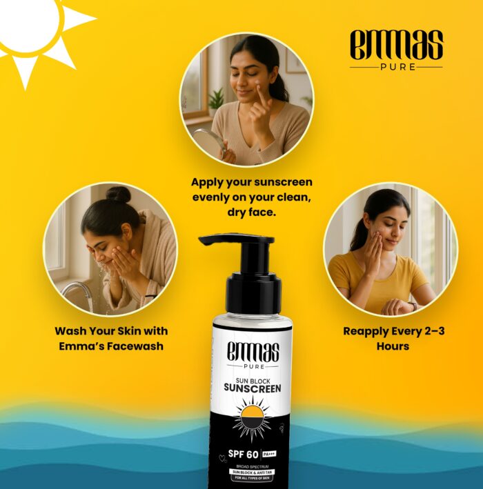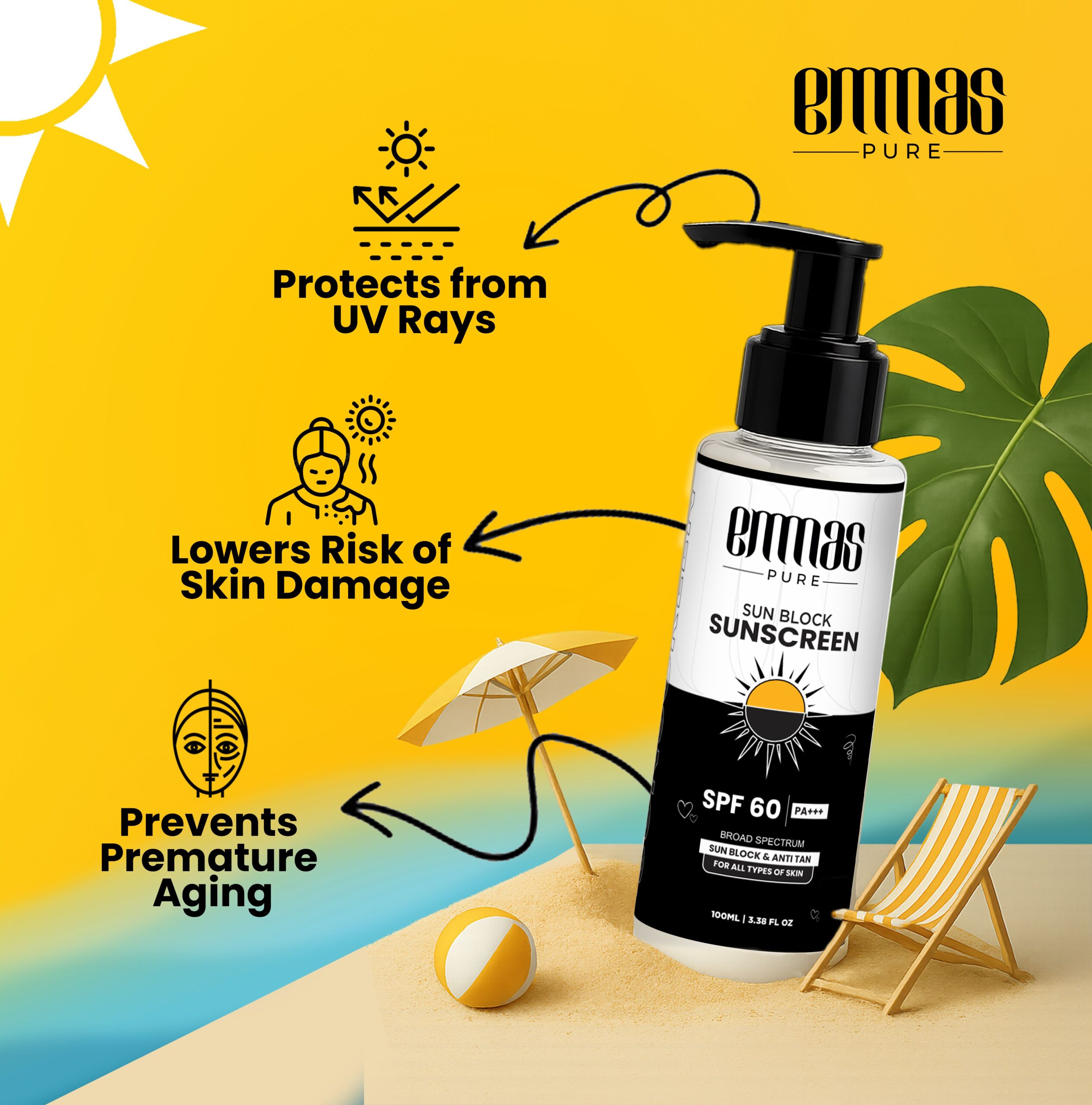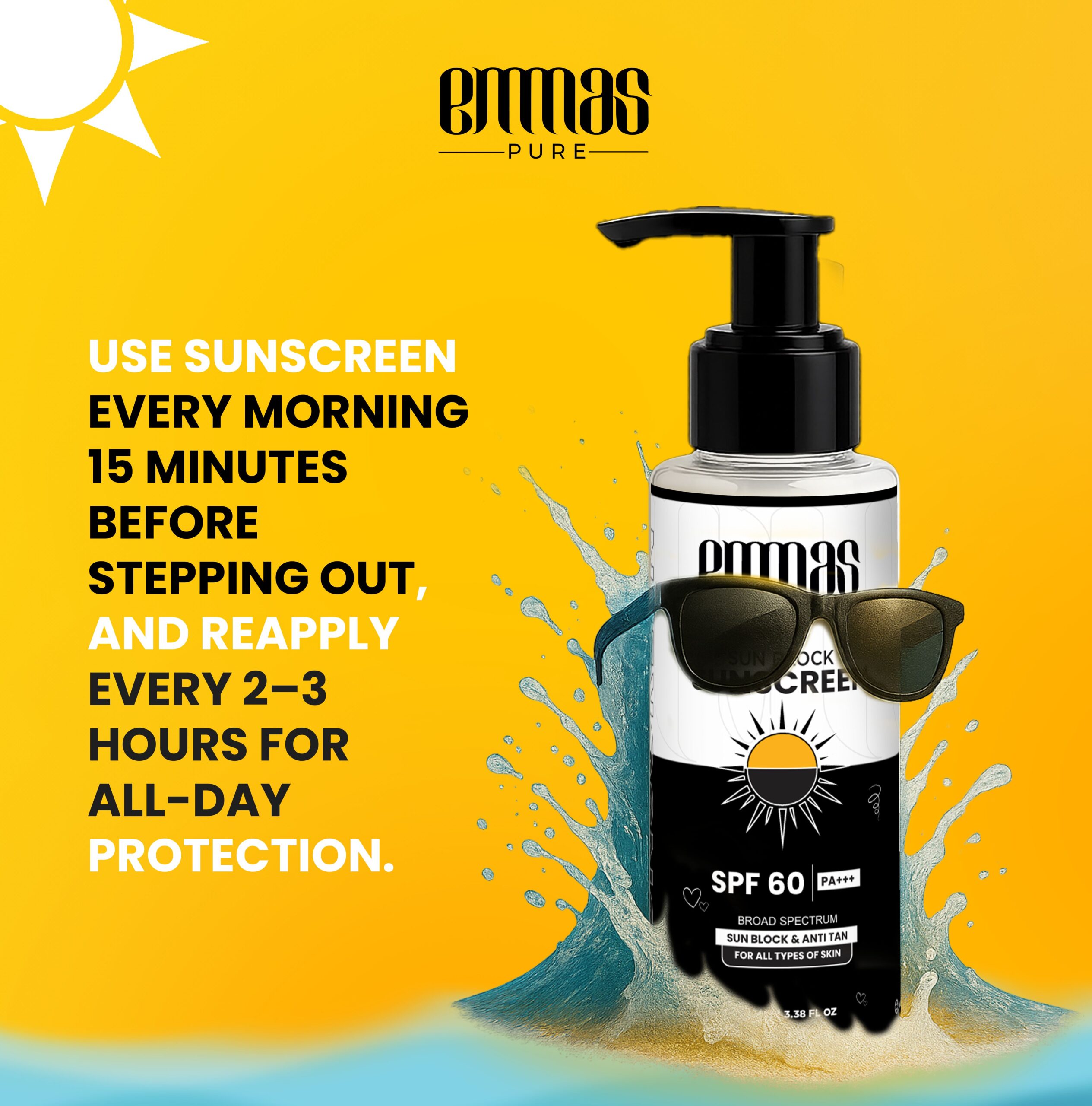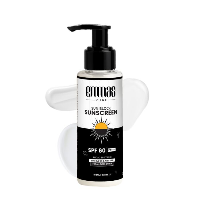 Protect your skin from the harsh effects of the sun with Emmas Pure Sunscreen SPF 60. This high-protection formula offers broad-spectrum coverage, shielding your skin from both burning UVB rays and aging UVA rays. Its lightweight, non-greasy texture absorbs quickly, making it comfortable for daily wear under makeup or on its own. The water-resistant formula ensures you stay protected even while swimming or sweating. Regular use helps to prevent sunburn, fight the formation of dark spots, and protect against the signs of premature aging. Made in India and free from parabens and fragrances, it’s the essential final step in your morning skincare routine.